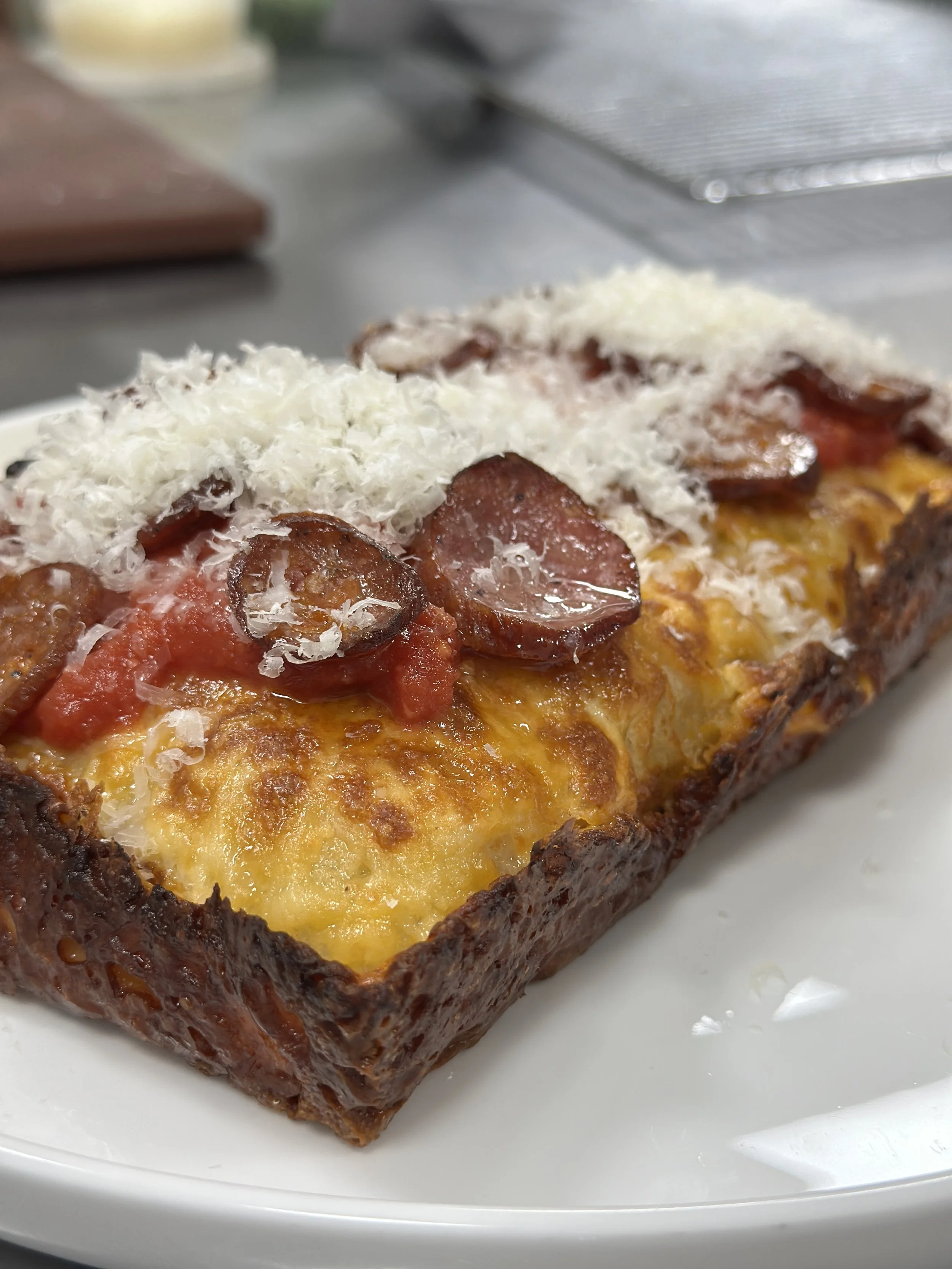A slice of stuffed lasagna topped with grated cheese and pepperoni slices served on a white plate.