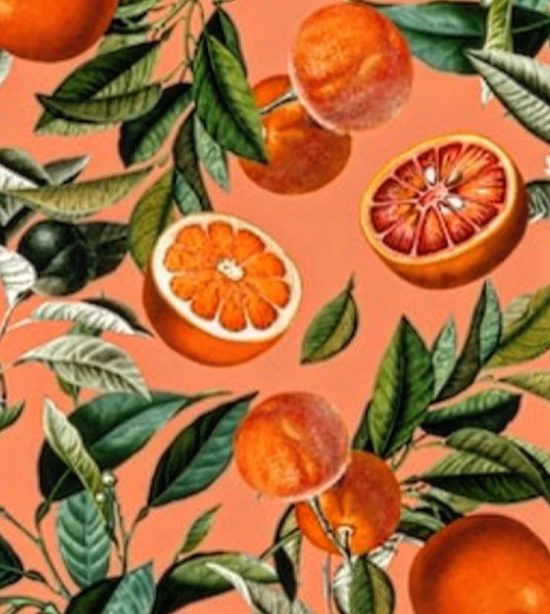 Pattern featuring oranges, blood oranges, and orange slices with green leaves on a peach background.