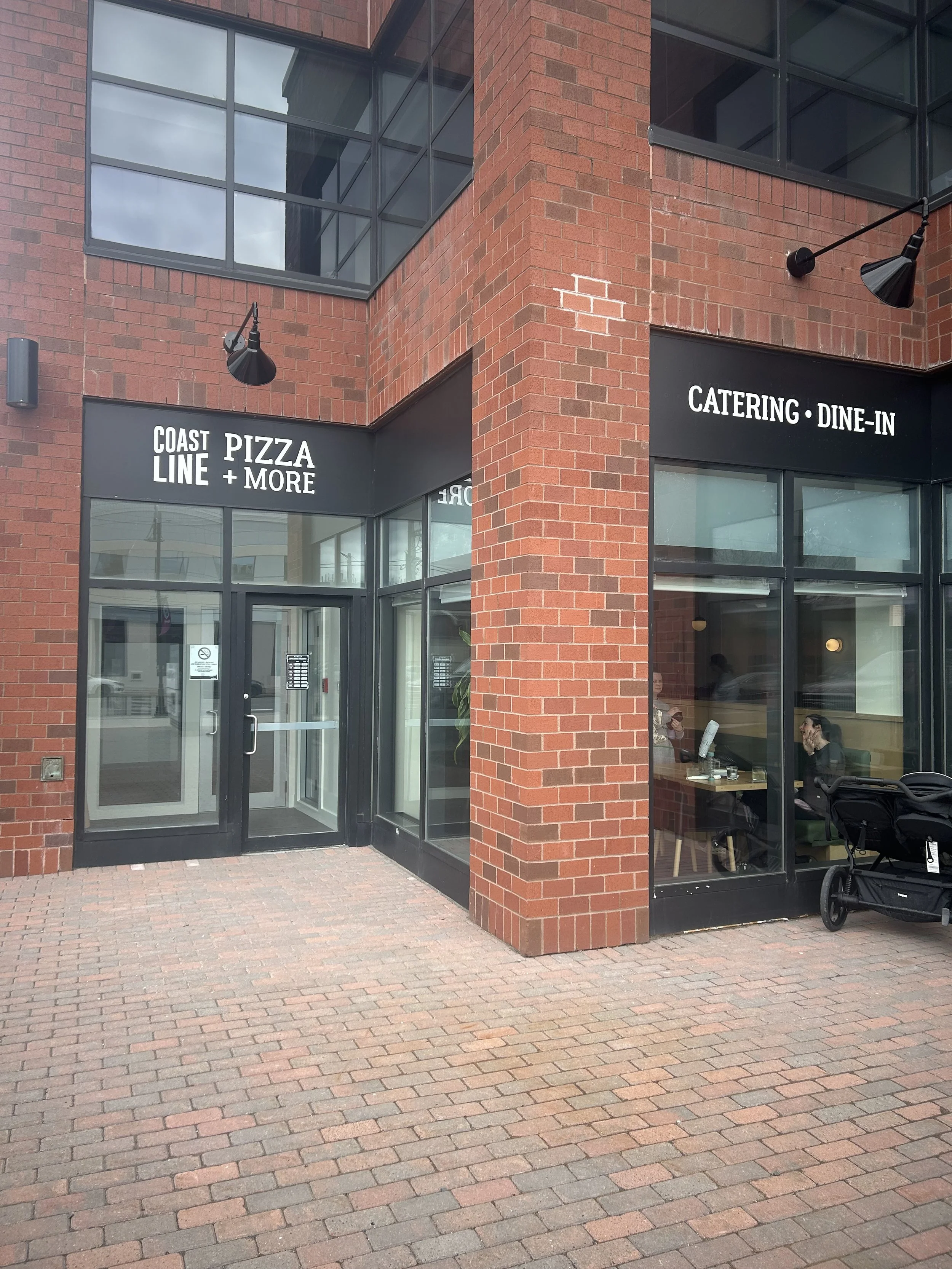 Exterior view of a restaurant called Coast Pizza, offering catering and dine-in, with brick walls, large glass windows, and a brick-paved sidewalk outside.