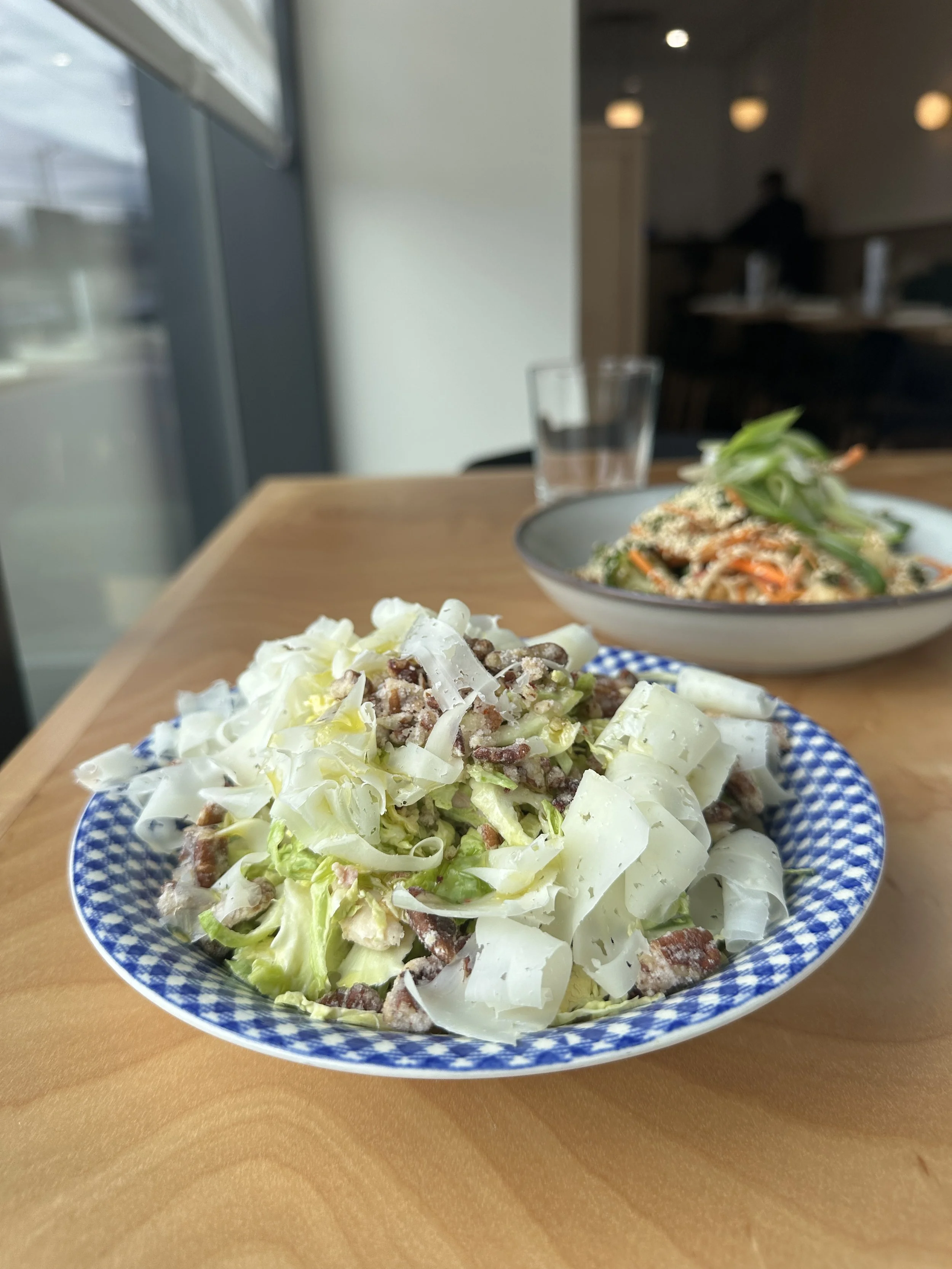 A bowl of Caesar salad with lettuce, bacon, and cheese on a wooden table, with another bowl of pasta and a glass of water in the background inside a restaurant.