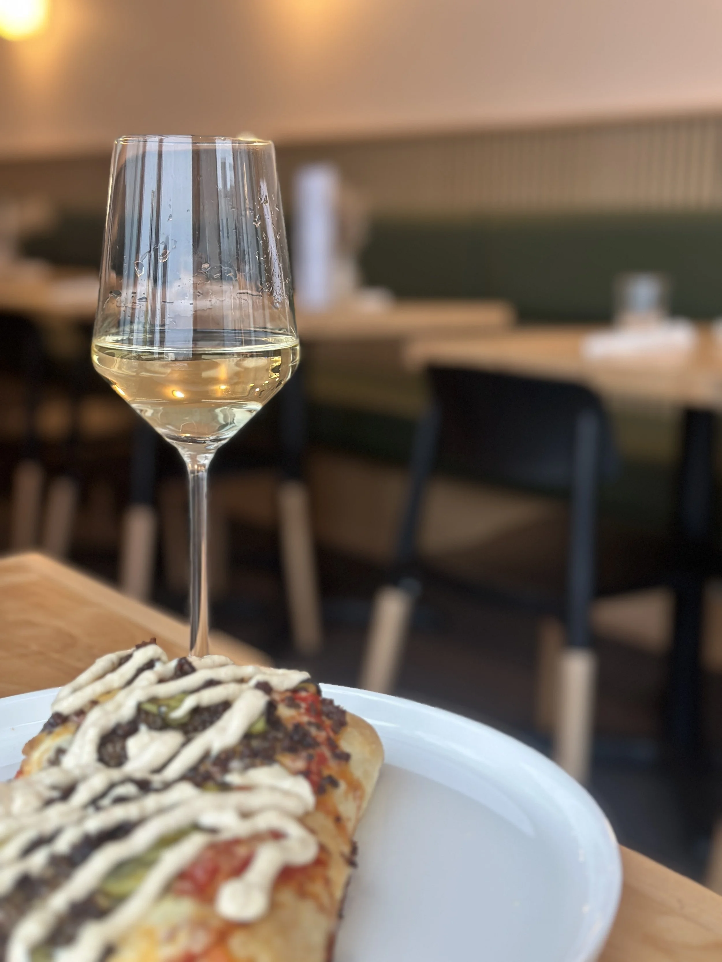 A glass of white wine and a plate with a slice of pizza topped with vegetables and drizzled with sauce, set on a wooden table in a restaurant.