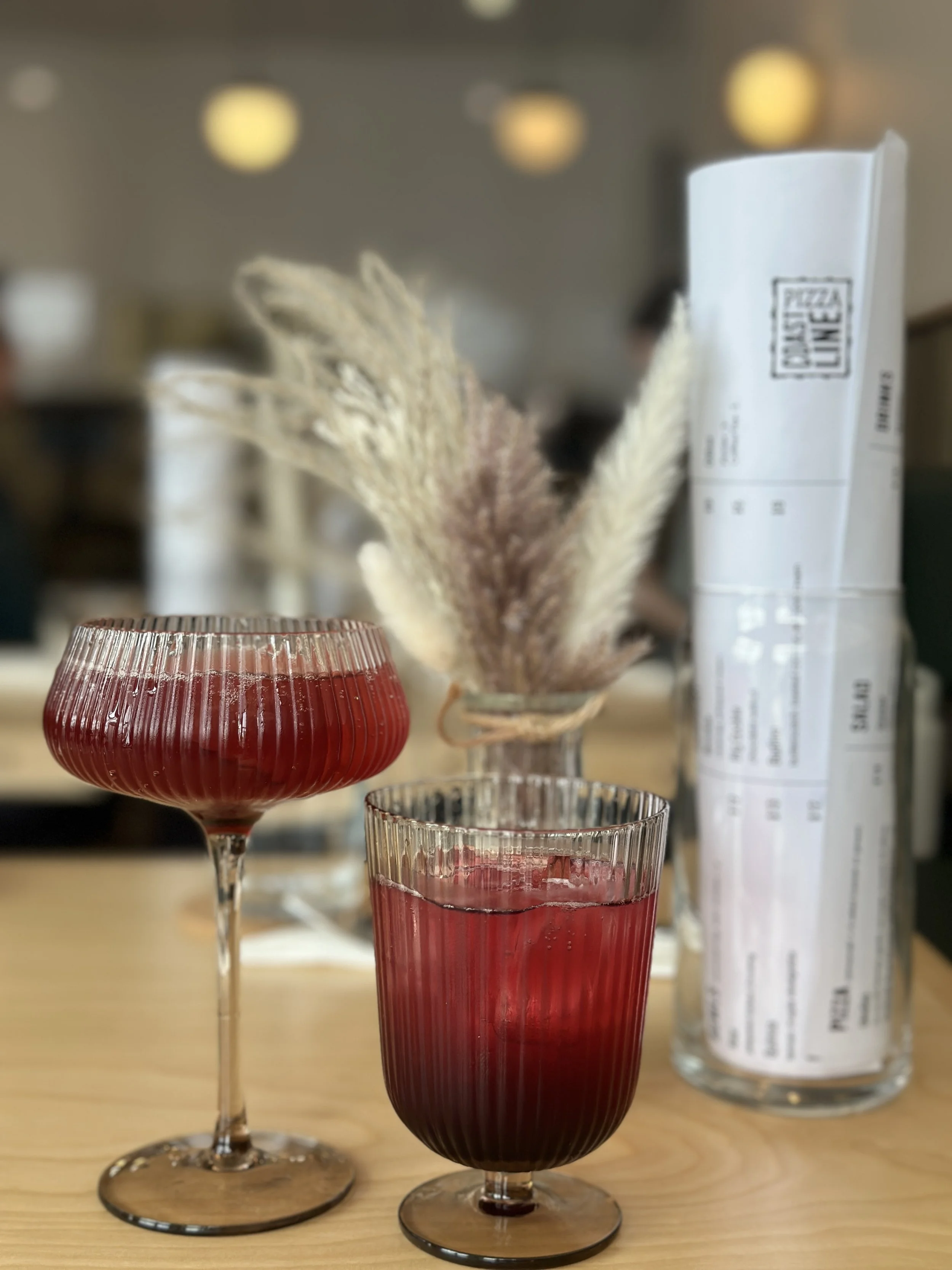 Two glasses with red beverages on a wooden table, one taller with a ribbed design, the other shorter. In the background, a small vase with dried pampas grass and a rolled-up paper or flyer.