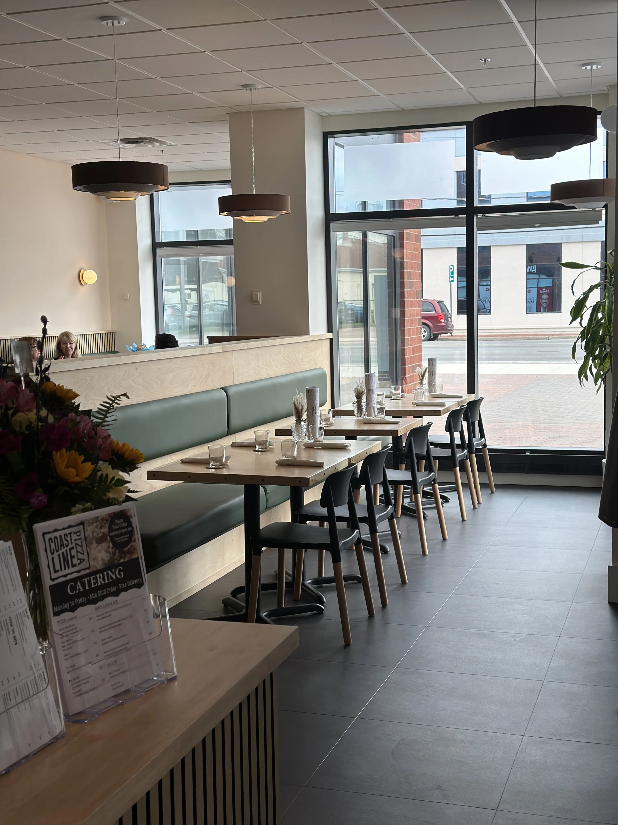 Empty restaurant interior with light wood tables, black chairs, green banquettes, wall-mounted lights, and large windows.