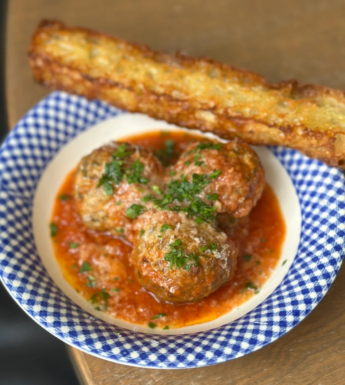 Meatballs in tomato sauce garnished with parsley, served with a piece of garlic bread on a checkered blue and white napkin.