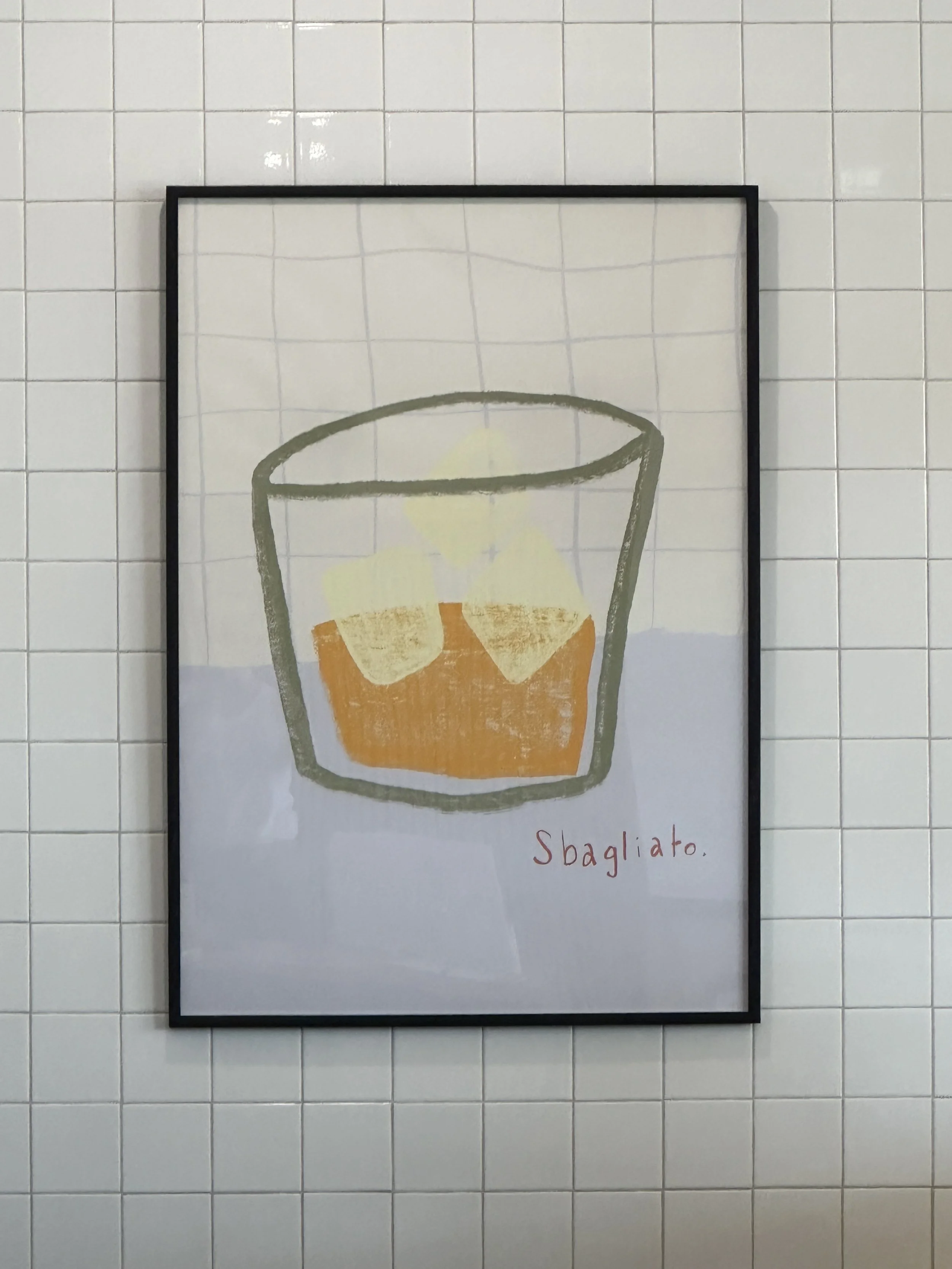 A framed drawing of a glass with ice cubes and a brown liquid, labeled 'Sbagliato' in red handwriting, hanging on a white tiled wall.