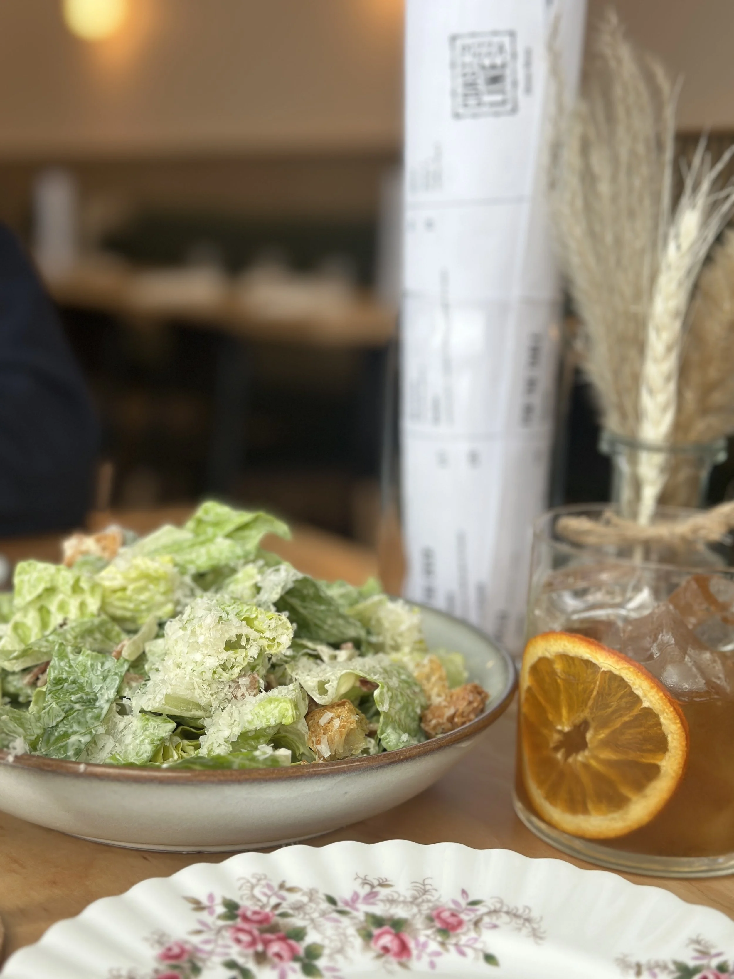 A bowl of Caesar salad, a glass of iced tea with a slice of orange, and a plate with a floral pattern on a wooden table.