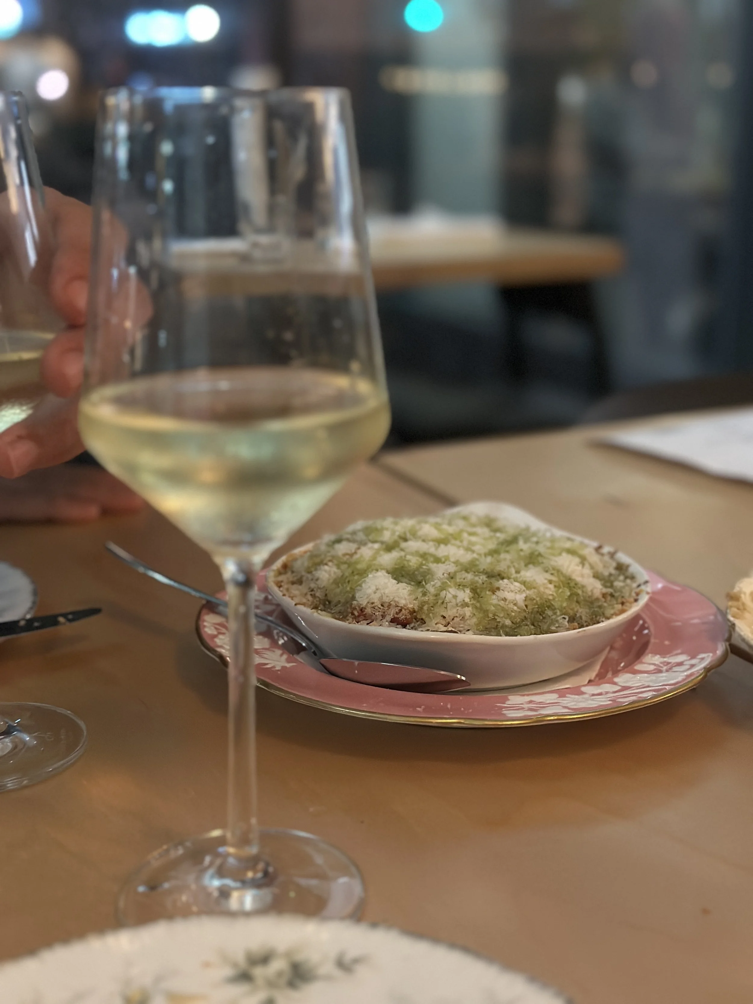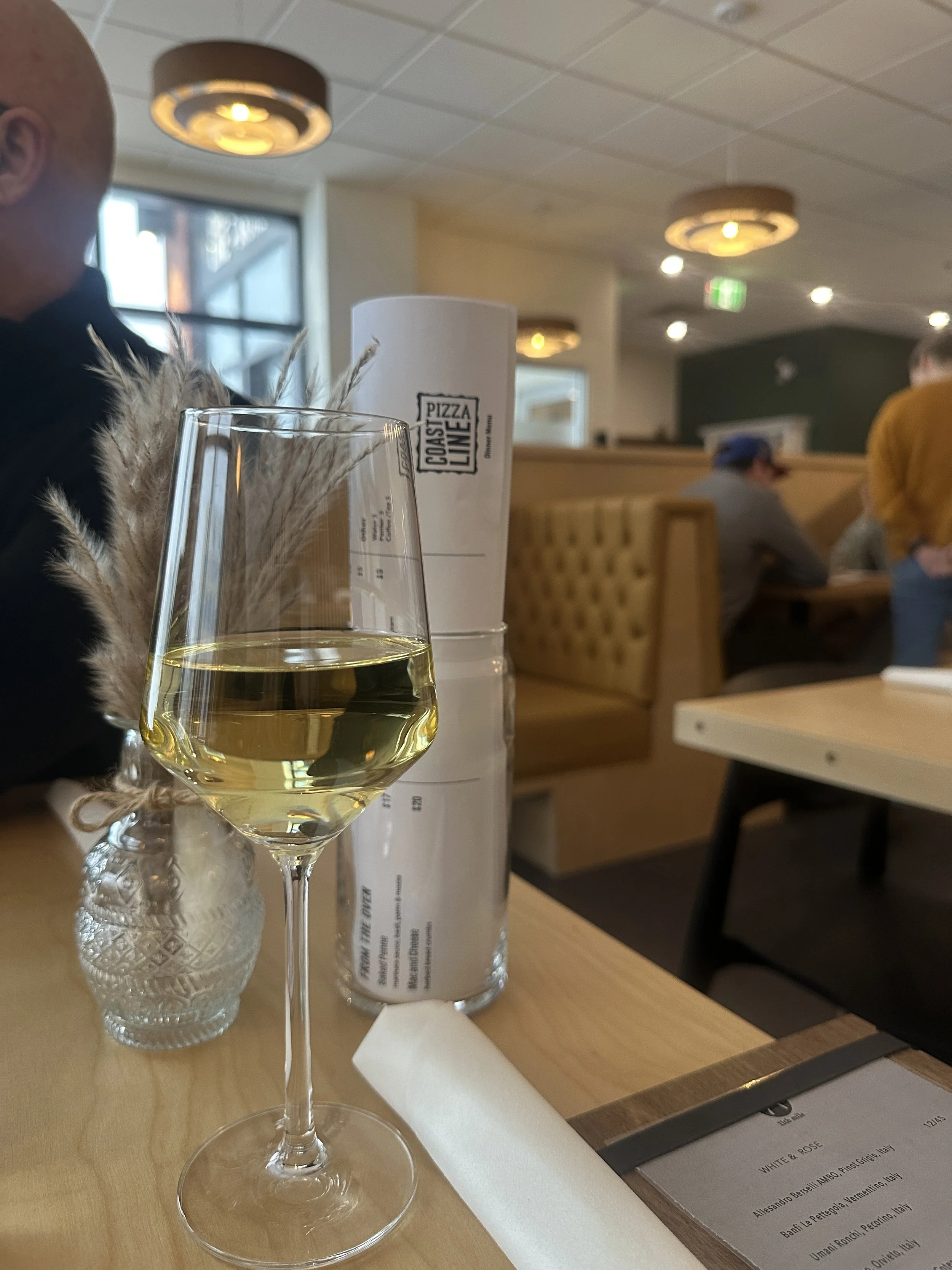A glass of white wine on a table in a restaurant with a small vase containing dried pampas grass, a tall salt shaker, and a menu, with some diners in the background.