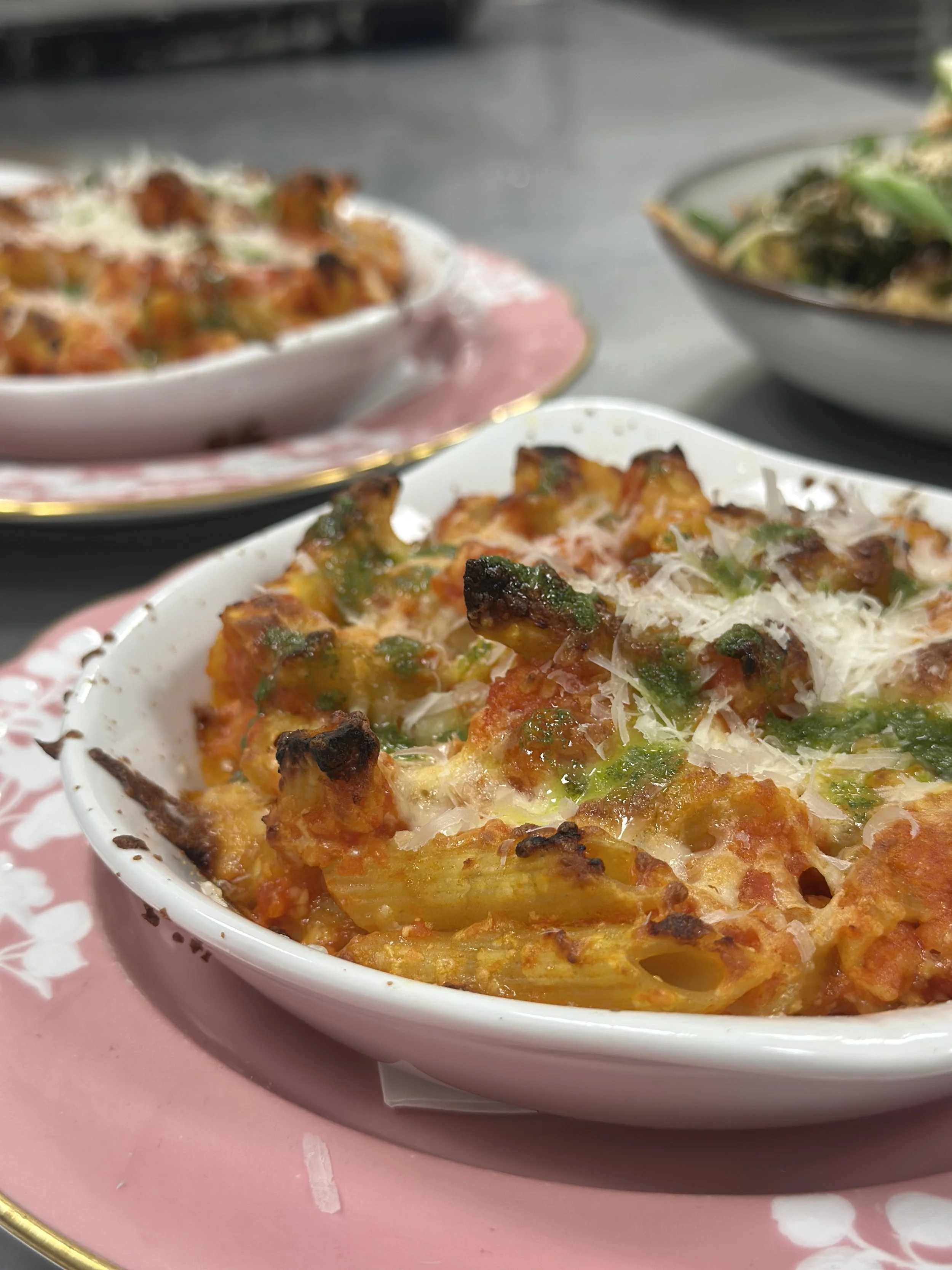 Baked pasta dish in a white bowl with melted cheese, basil pesto, and grated cheese, on a pink plate.
