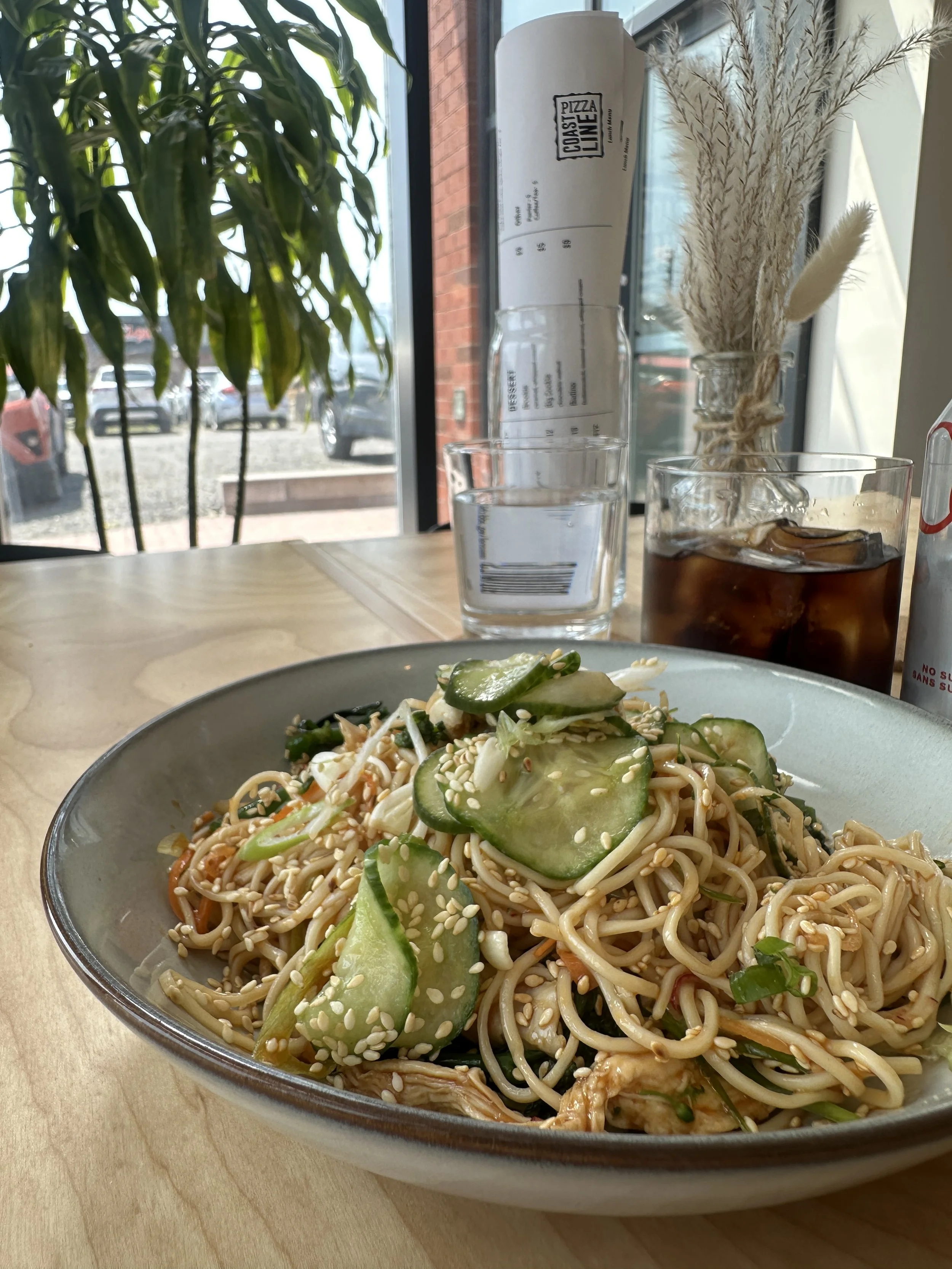 A bowl of Asian-style noodle salad with cucumber slices topped with sesame seeds, on a wooden table at a restaurant. In the background are a glass of iced cola, a glass of water with a paper food wrapper, a small vase with dried flowers, and a window